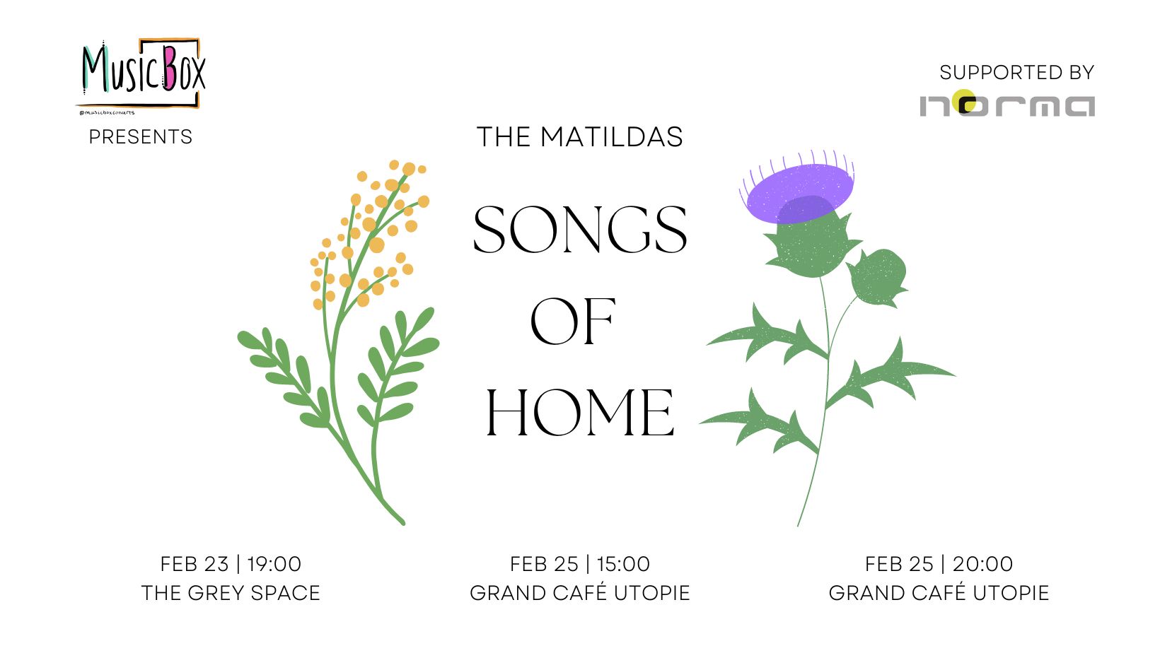 “Songs of Home”: Grande Cafe Utopie, The Hague (25 Feb 2023), Grey Space in the Middle, The Hague (23 Feb 2023), Riderzaal kasteel, Helmond (30 Oct 2022), Grande Cafe Utopie, The Hague (29 Oct 2022), 3TREESceramics studio, The Hague (28 Oct 2022)